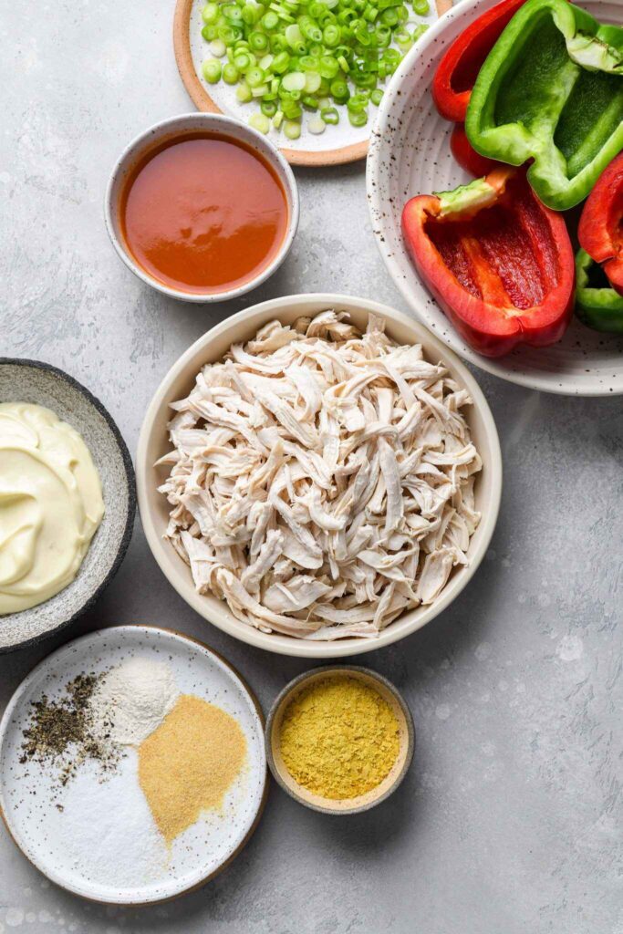 • In a large bowl, combine shredded chicken, buffalo sauce, coconut cream, and nutritional yeast.