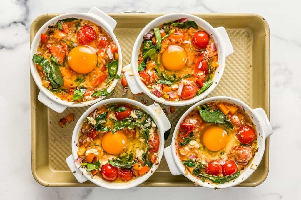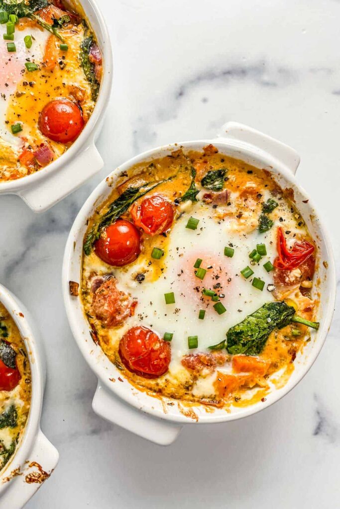 Baked feta eggs are a hands-off, oven-baked version of scrambled eggs, enriched with creamy feta cheese and olive oil. The feta softens in the oven, blending perfectly with the eggs for a dish that’s creamy, salty, and luxurious.